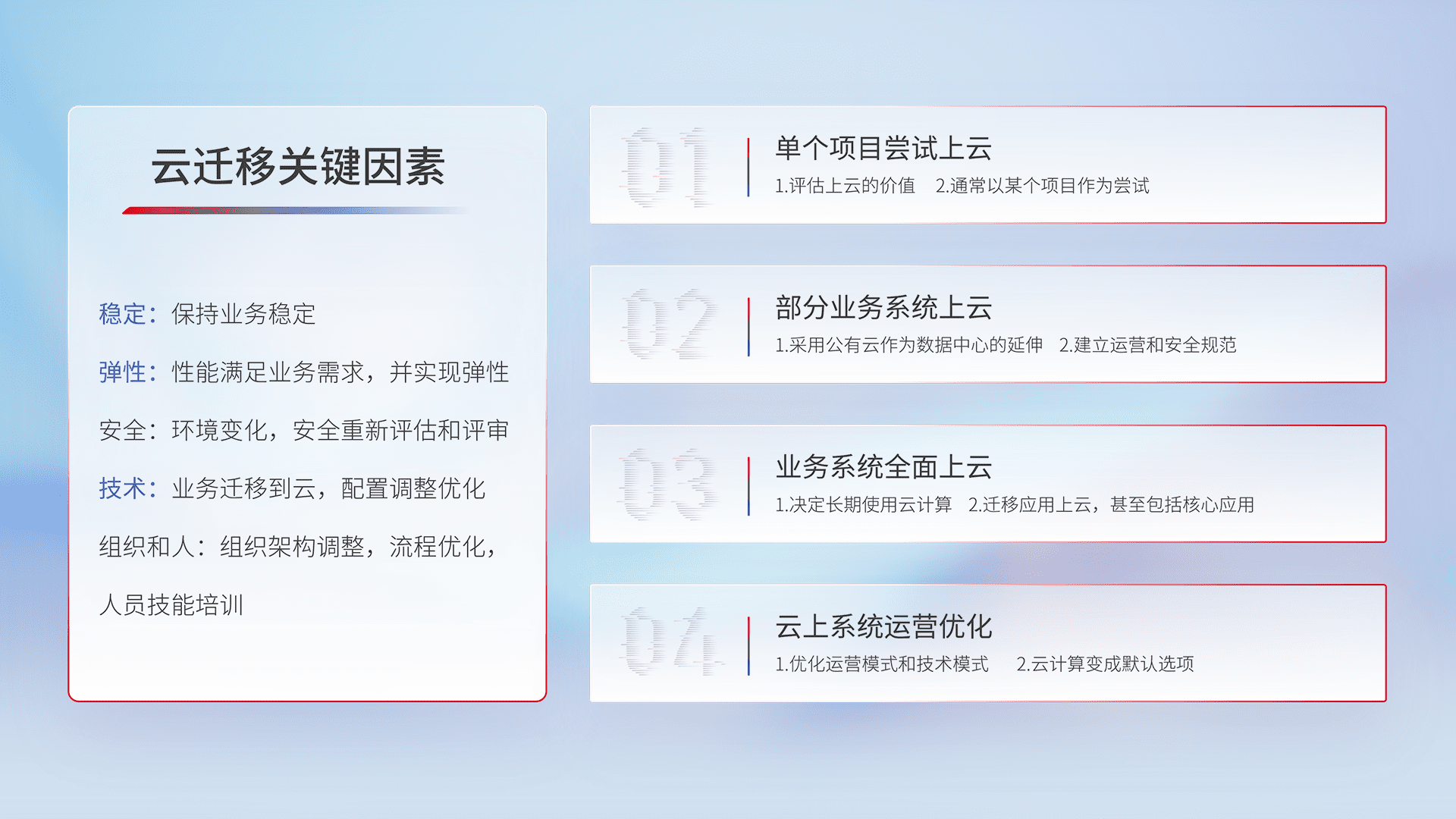 结合实际业务,,,,从规划设计、、云平台选型、、云原生改造、、、、数据迁移、、、集成交付,,迁移全过程为客户识别最佳上云路径,,,做好风险识别管理,,,设计网络架构、、、身份权限、、、、安全审计合规、、、、操作审计、、、、日志审计、、、监控告警策略、、多站点容灾设计等,,,对云上基础设施进行整体规划,,,提升IT治理水平,,,,以满足弹性、、、高可用、、、高性能的需求。。。