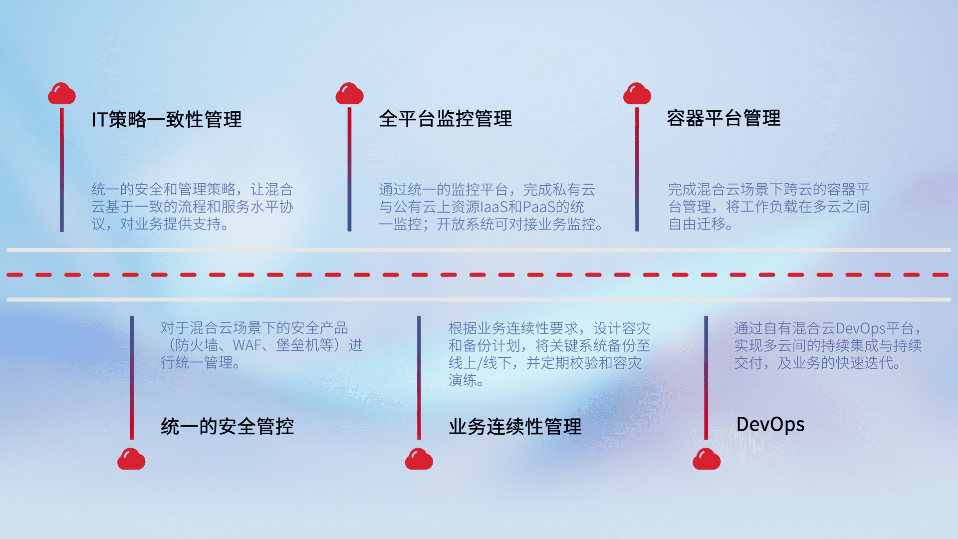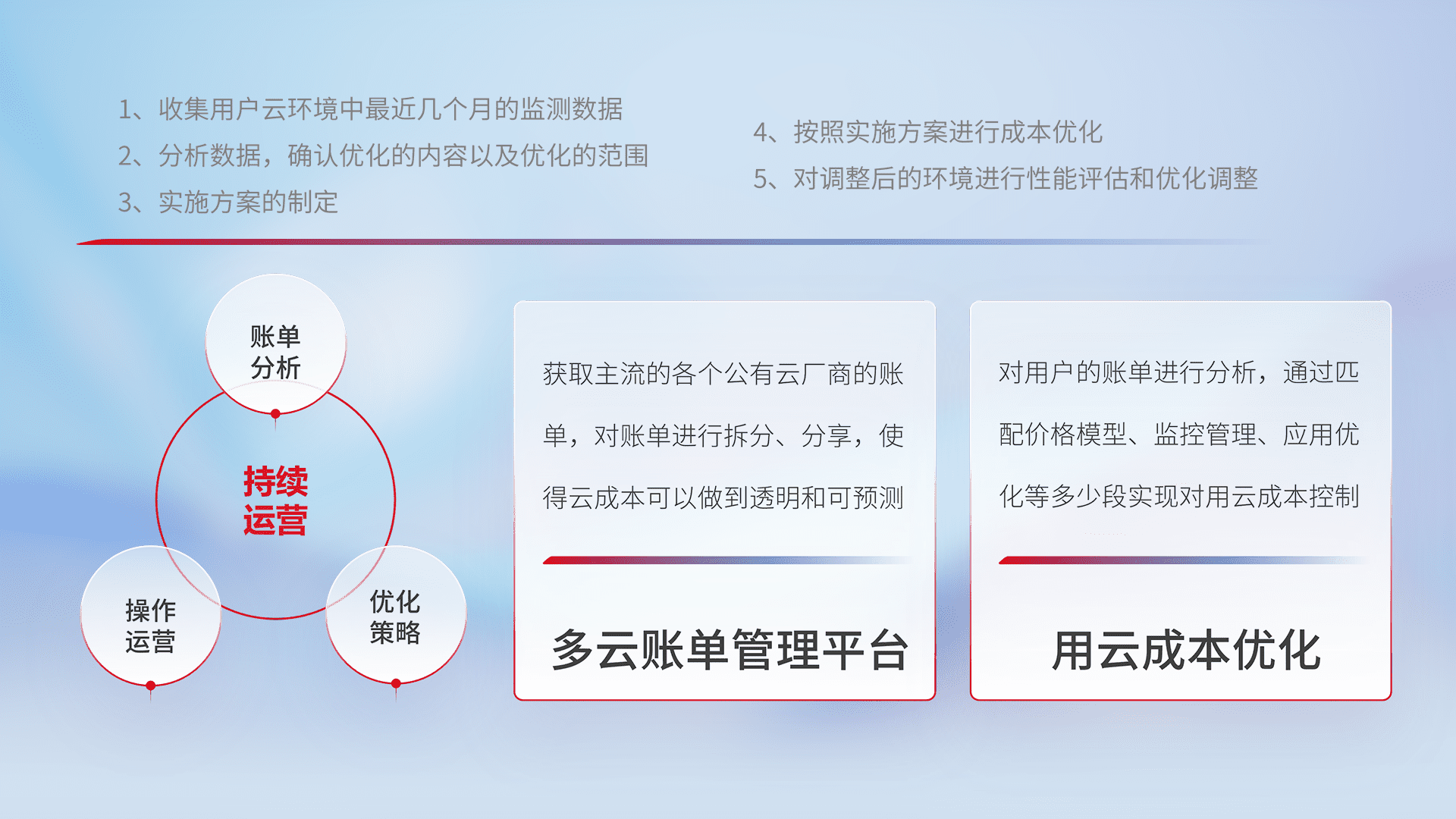 通过多云纳管,,,以统一的资源数据模型把客户的云资源进行抽象和封装,,,,进而实现对多云资源的统一操作,,保障云资源管理的可靠性、、、、稳定性与可用性。。。。量身定制化运维内容,,,,配置、、、开发运维、、、补丁管理、、备份、、、监控、、、、认证和访问管理、、审计和日常巡检等,,,保障在用云过程中的可靠度,,,,稳定度以及高可用率。。。。